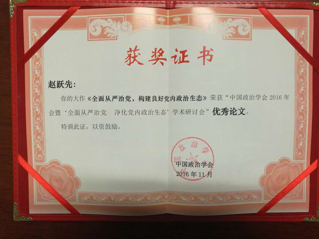 教师赵跃先教授撰写的论文《全面从严治党,构建良好党内政治生态》获“优秀论文”奖。