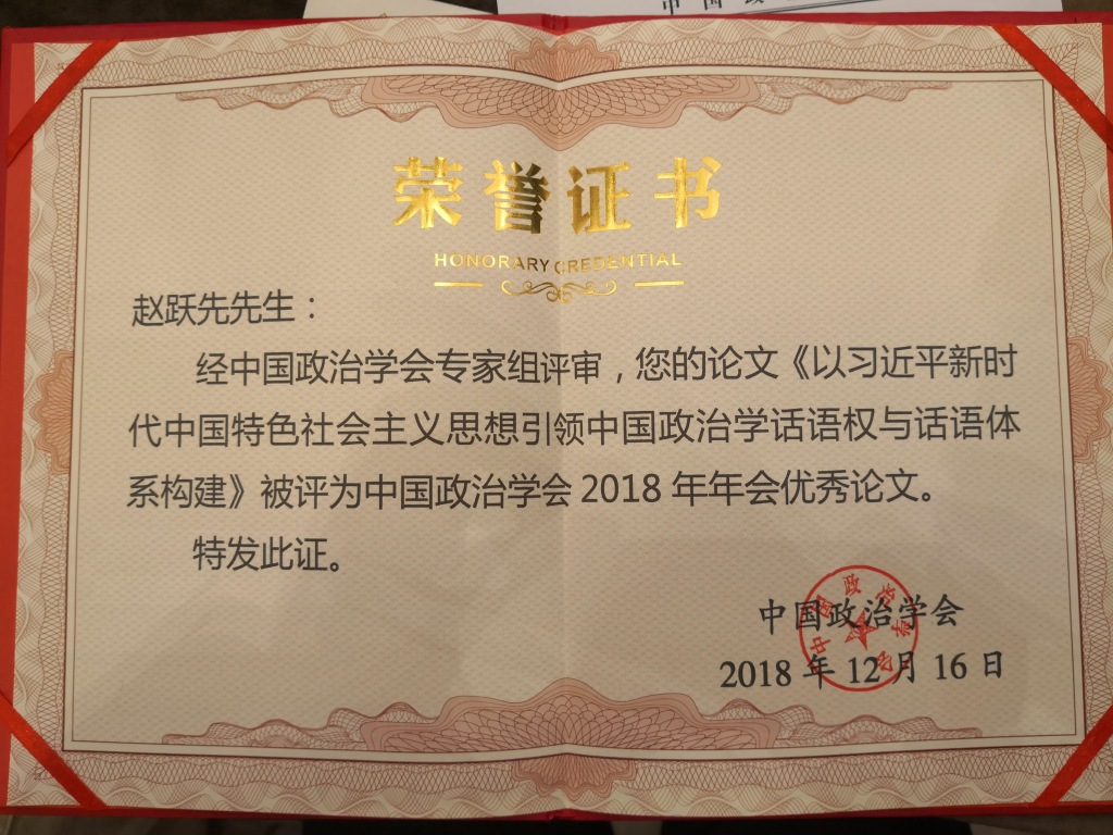 本次会议共设6个分论坛,与会代表分别围绕马克思主义政治学话语体系建设的相关理论议题,以及改革开放以来中国的政治建设与政治学发展展开了热烈讨论和对话。各分论坛代表在闭幕会上就分论坛的讨论成果进行了汇报和交流。会议还为获得本次年会优秀论文的18位作者颁发了荣誉证书,我校赵跃先、胡志远老师所撰写的论文获此殊荣。中国政治学会副会长兼秘书长杨海蛟教授在总结发言中充分肯定了会议研讨的成果和会议组织的质量,并再次表达了对夏书章教授的崇高敬意。