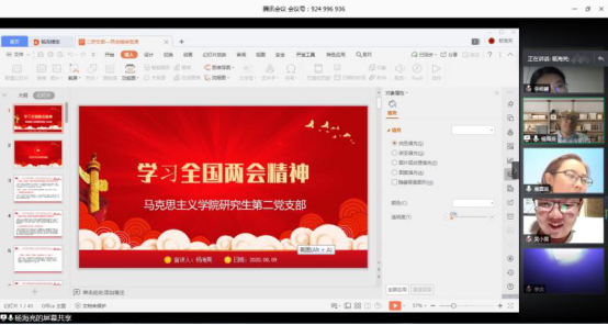 研究生第二党支部通过线上方式开展了专题党课学习,旨在鼓励支部党员聚焦两会热点,学习两会精神,提升党性修养。此次党课学习由组织委员姜延博主持,由杨海亮书记主讲,支部全体党员参会学习。