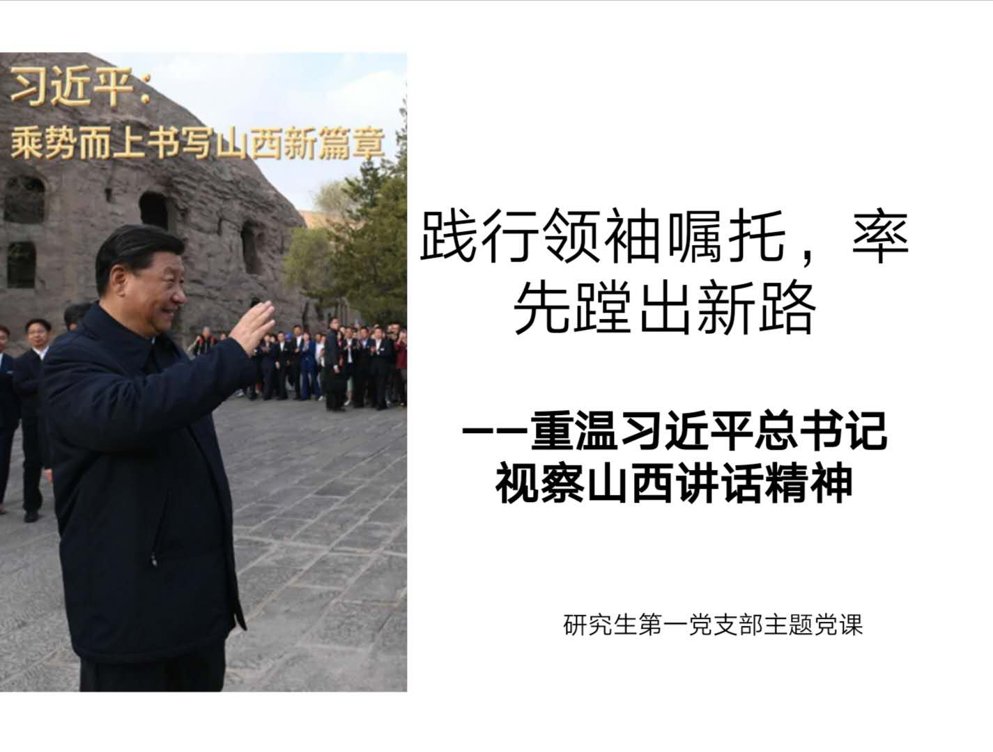 7月5日,研究生第一党支部书记王艳以《“践行领袖嘱托,率先蹚出新路”——重温习近平总书记视察山西讲话精神》为题,为支部全体党员上了一堂生动的党课。王书记首先梳理了总书记视察山西的行程,认为总书记的讲话从四个方面指明了山西要率先蹚出的新路子:将产业发展贯穿脱贫攻坚、全面小康和乡村振兴全过程;历史文化遗产的保护、内涵挖掘和开发;转型发展的新路子;绿色发展之路。并结合2017年6月习近平总书记视察山西工作情况,从感受温暖、感受总书记党中央在山西发展的关键时期对山西的关心和督促;忠诚为民,坚持以人民为中心的发展思想;坚持不懈抓好党的建设三个方面谈了自己的感想。