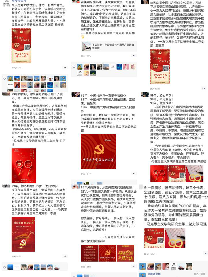 一、认真开展线上政治理论学习。研究生第二党支部借助微信工作平台在建党99周年当日推出习近平在“不忘初心、牢记使命”主题教育总结大会上的讲话金句、一张图读懂中共山西省委第十一届十次全会的学习材料,突出重点,提升学习实效。支部动员党员认真学习,掀起学习热潮。