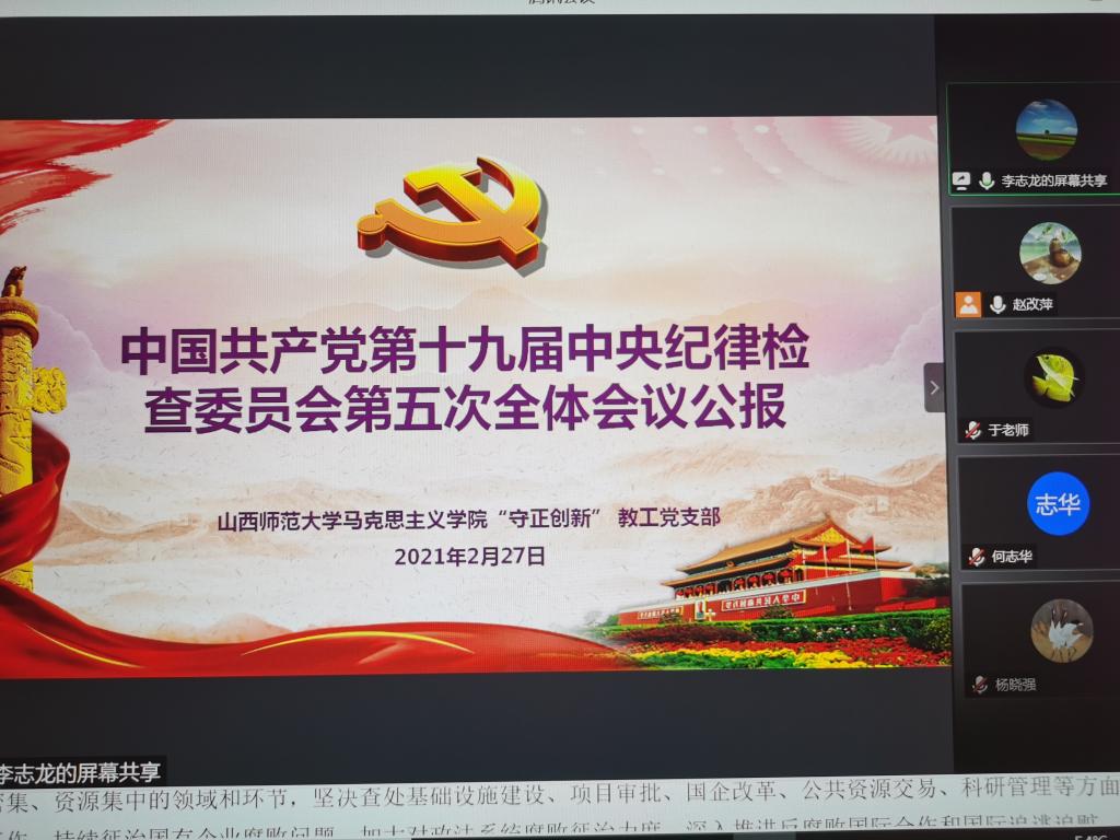 “守正创新”教工党支部在腾讯会议上开展支部“提高‘政治三力’,发扬‘三牛’精神”主题党日活动。支部全体党员及入党积极分子参加,会议由支部书记赵改萍主持。