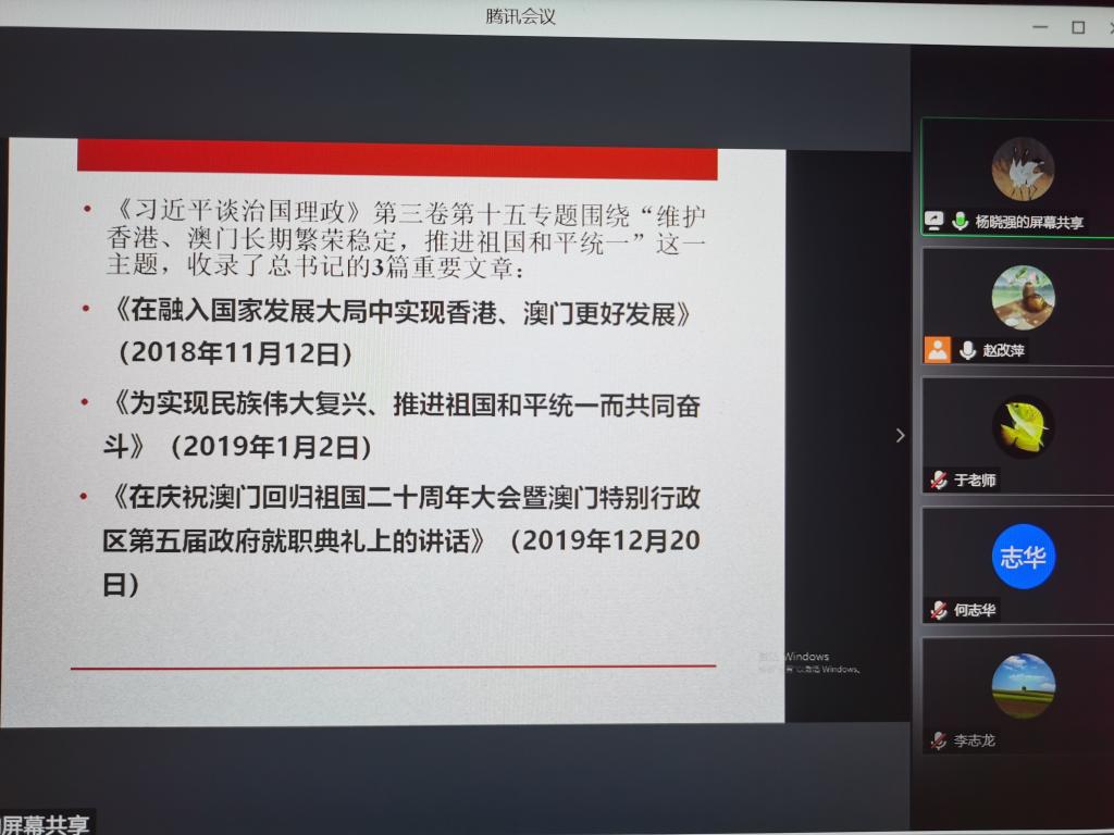 会上,杨晓强领学《习近平谈治国理政》第三卷第十五专题《维护香港、澳门长期繁荣稳定,推进祖国和平统一》;何志华领学《习近平谈治国理政》第三卷第十八专题《推动共建“一带一路”走深走实”》;李志龙领学《中国共产党第十九届中央纪律检查委员会第五次全体会议公报》;赵改萍领学习近平总书记在全国脱贫攻坚总结表彰大会上的重要讲话。