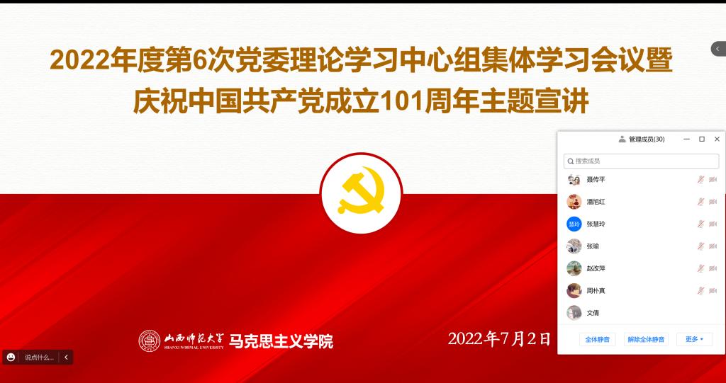 党委理论学习中心组通过线上腾讯会议举行集体学习会议暨庆祝中国共产党成立101周年主题宣讲活动。全体中心组成员、师生党员及我校大学生理论宣讲团成员参加了会议。会议由院党委书记乔瑞主持。