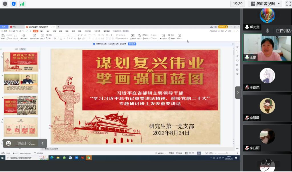 研究生第一党支部开展主题党日活动,专题学习习近平在省部级主要领导干部“学习习近平总书记重要讲话精神,迎接党的二十大”专题研讨班开班式上的重要讲话。支部书记王艳专题领学,全体党员参加学习。