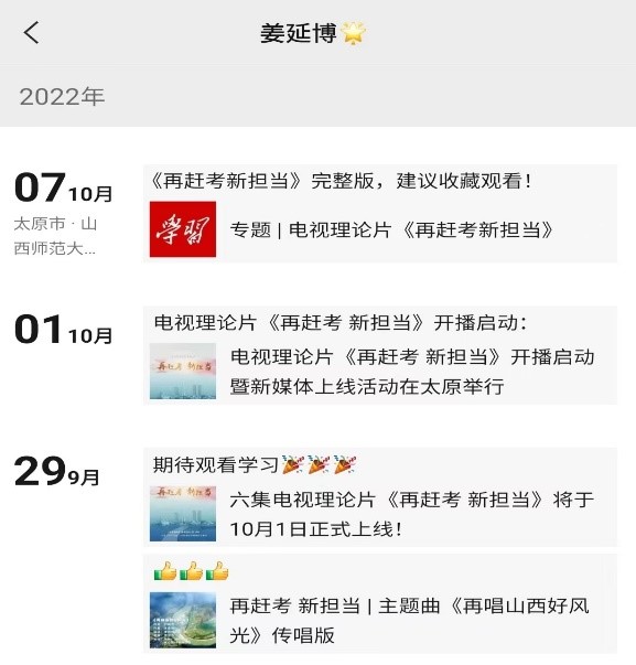 在欢度国庆、喜迎二十大胜利召开之际,中共山西省委宣传部与山西广播电视台联合推出六集电视理论片《再赶考·新担当》。该片以“创新、协调、绿色、开放、共享”的新发展理念为主线,通过翔实的数据、典型的事例,展现各行各业各领域发生的深刻变革,突出反映山西省在全方位推动高质量发展上不断取得新突破的生动实践和重要成就,激励全省上下走好新的“赶考”之路。
