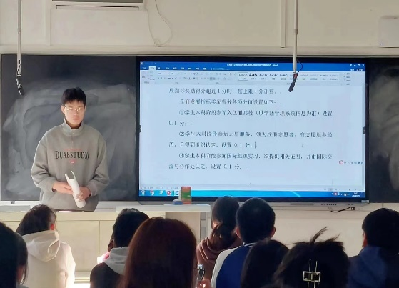推荐免试研究生的方案,同学们明确了推免的具体标准和要求,激励同学们向着高标准、高要求努力学习。最后,杜老师指出今天努力学习,是为了明天能够自由地选择自己想要的生活,真正的自由一定是出现在对必然的清楚把握之后的。希望大家都通过自己的努力,成长成材,将来为我们第二个百年奋斗目标的实现贡献自己的一份力量。