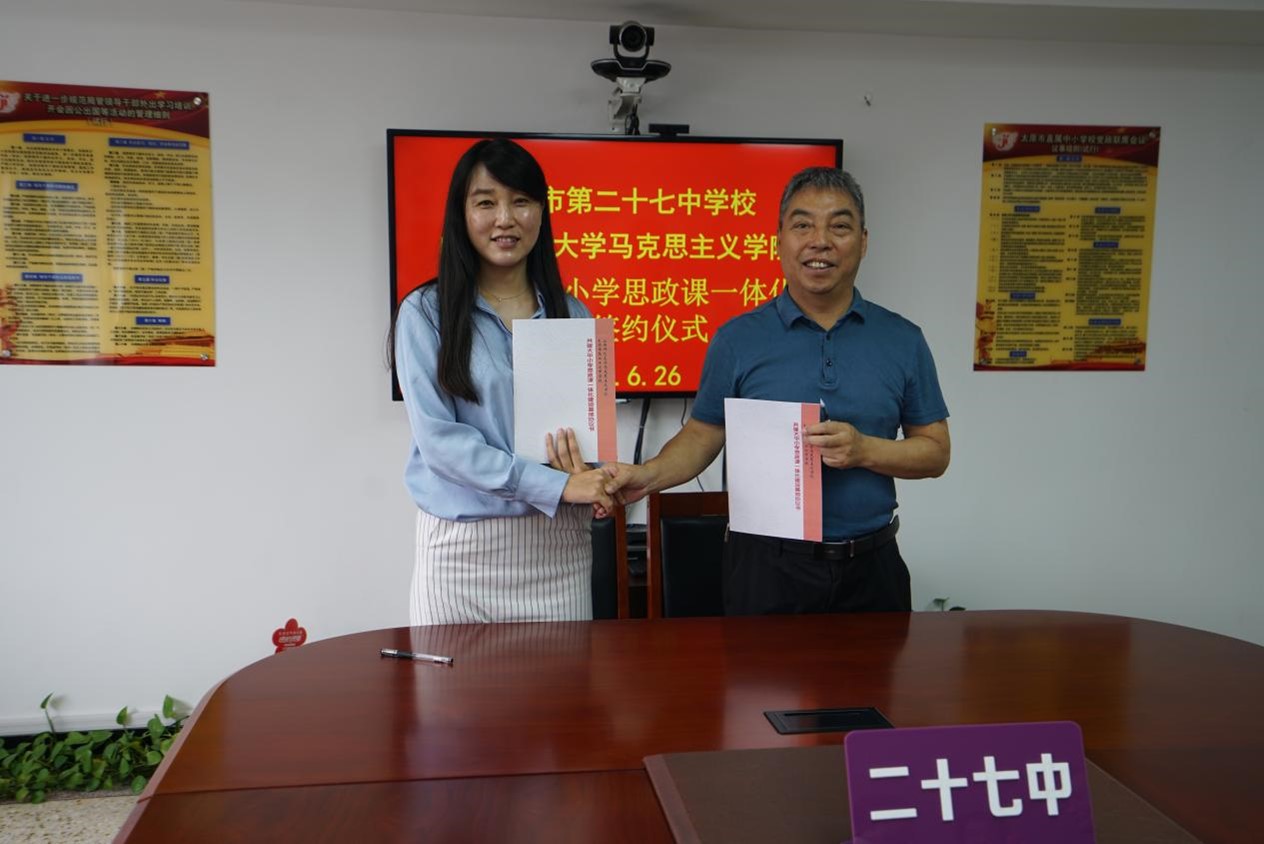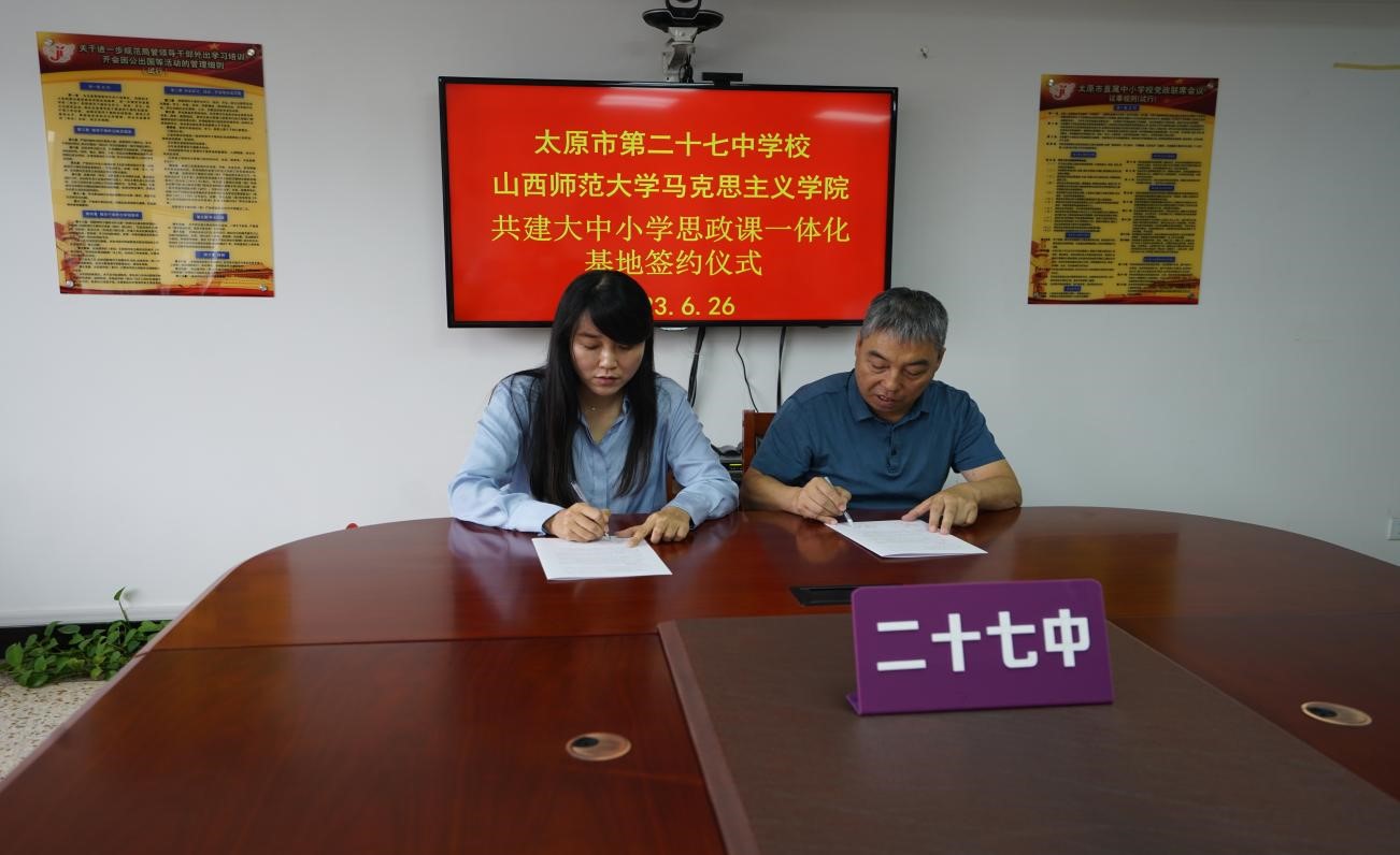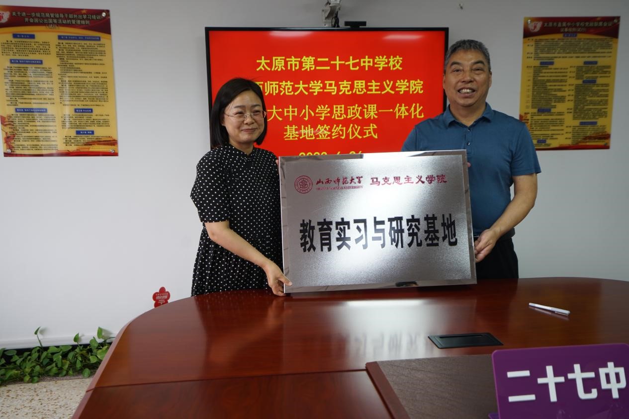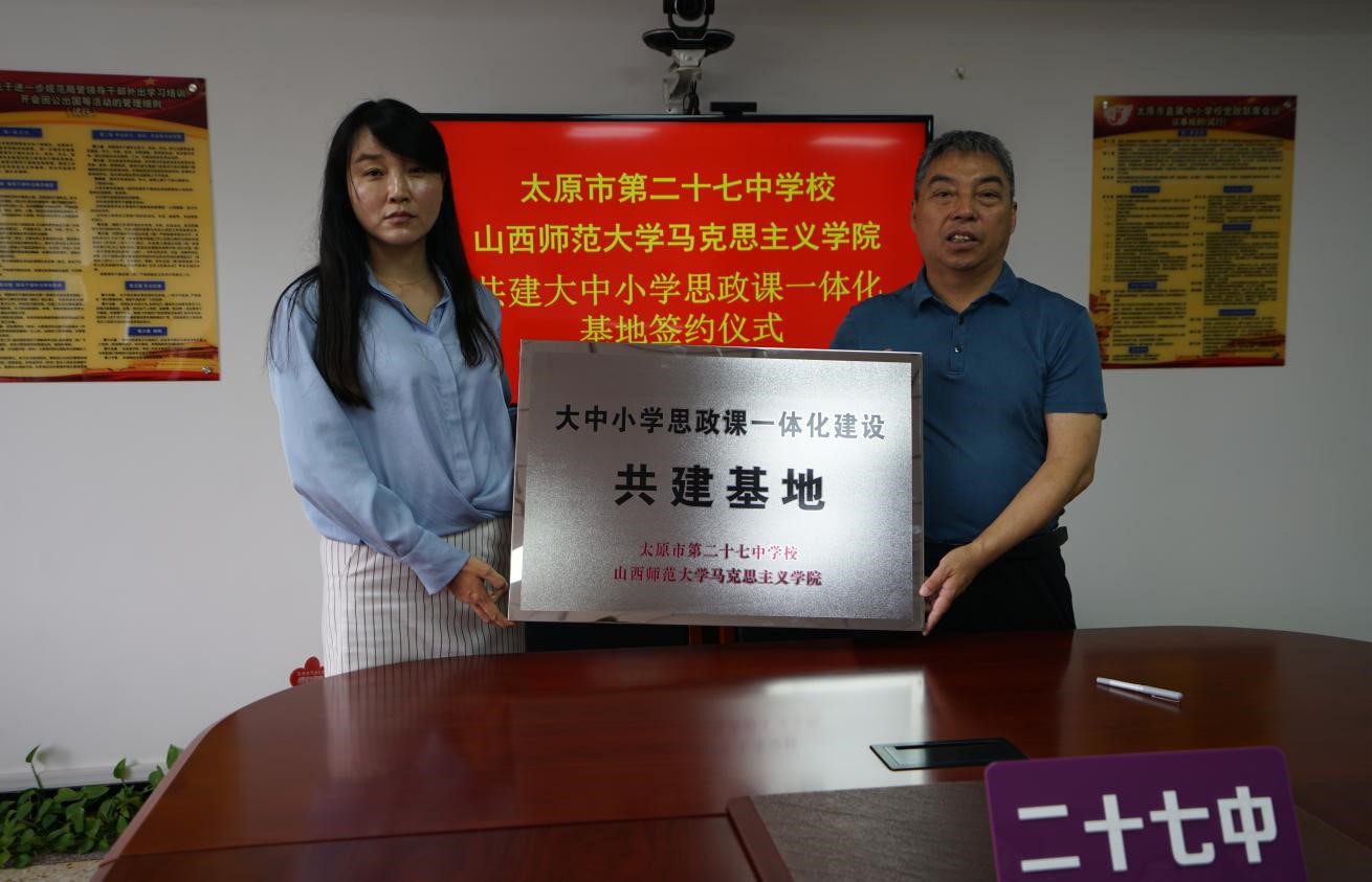 与太原市第二十七中学校大中小学思政课一体化建设共建基地、教育实习与研究基地签约授牌仪式在太原市第二十七中学校隆重举行。