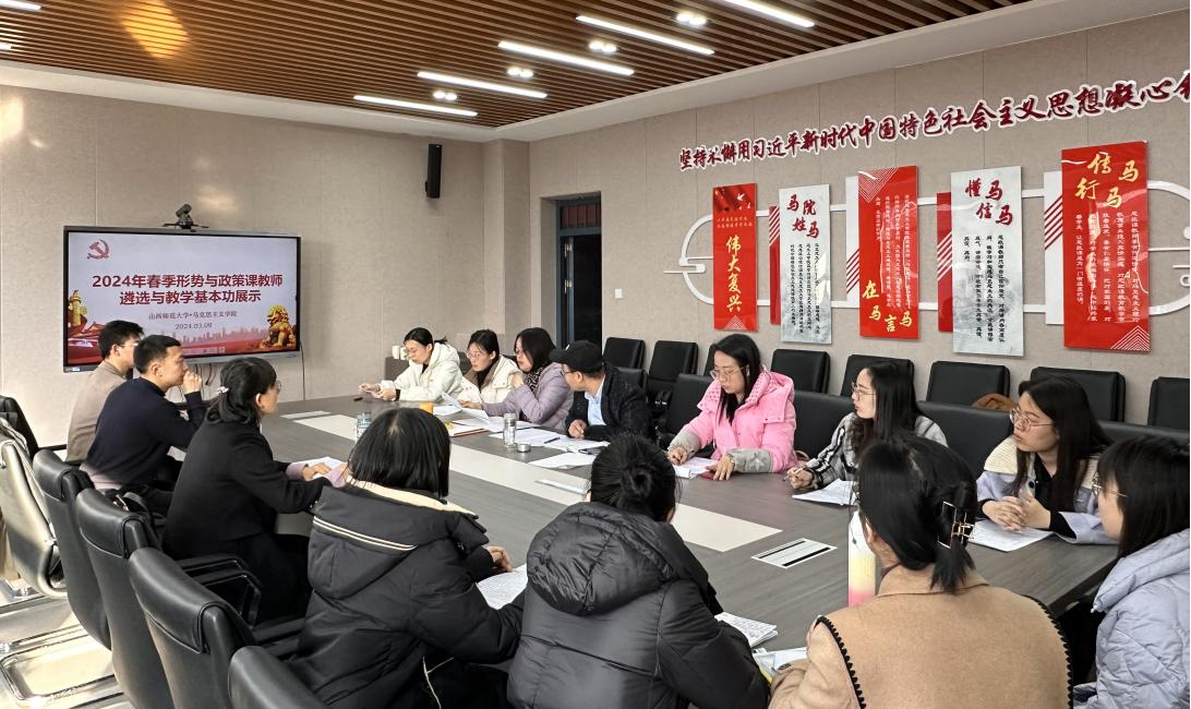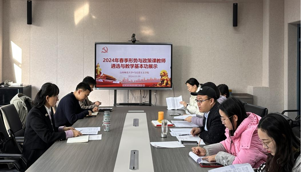 举办2024年春季《形势与政策》课兼职教师遴选与教学基本功展示活动,18名青年教师积极参与,展示活动由形势与政策教研室主任杨源主持。