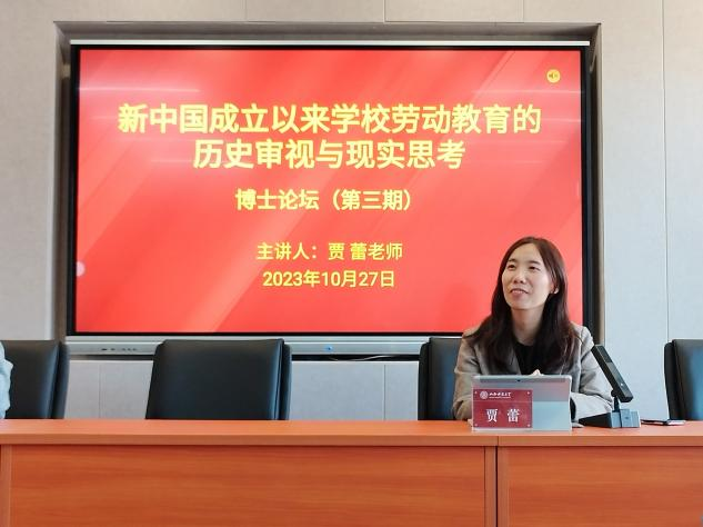 接着,贾蕾老师作了题为《新中国成立以来学校劳动教育的历史审视与现实思考》的报告。她以新中国成立为背景,从文章的选题缘由、写作思路出发,着重分析为什么要开展学校劳动教育,怎样开展学校劳动教育,讲述了学校劳动教育的内容、途径、教学目标等重要内容,同时指出了学校劳动教育的发展现状以及存在的问题。她表示,学校劳动教育与社会现实状况、与中央导向密切相关,应促进强国与育人的深度融合,理解中华民族伟大复兴与学校劳动教育的紧密联系,弘扬新时代劳模精神、劳动精神和工匠精神,进行创造性劳动教育,把新时代劳动教育的育人效果与育人价值鲜明的体现出来,让学生成为堪当民族复兴大任的时代新人,使学生成为社会主义建设者和接班人。