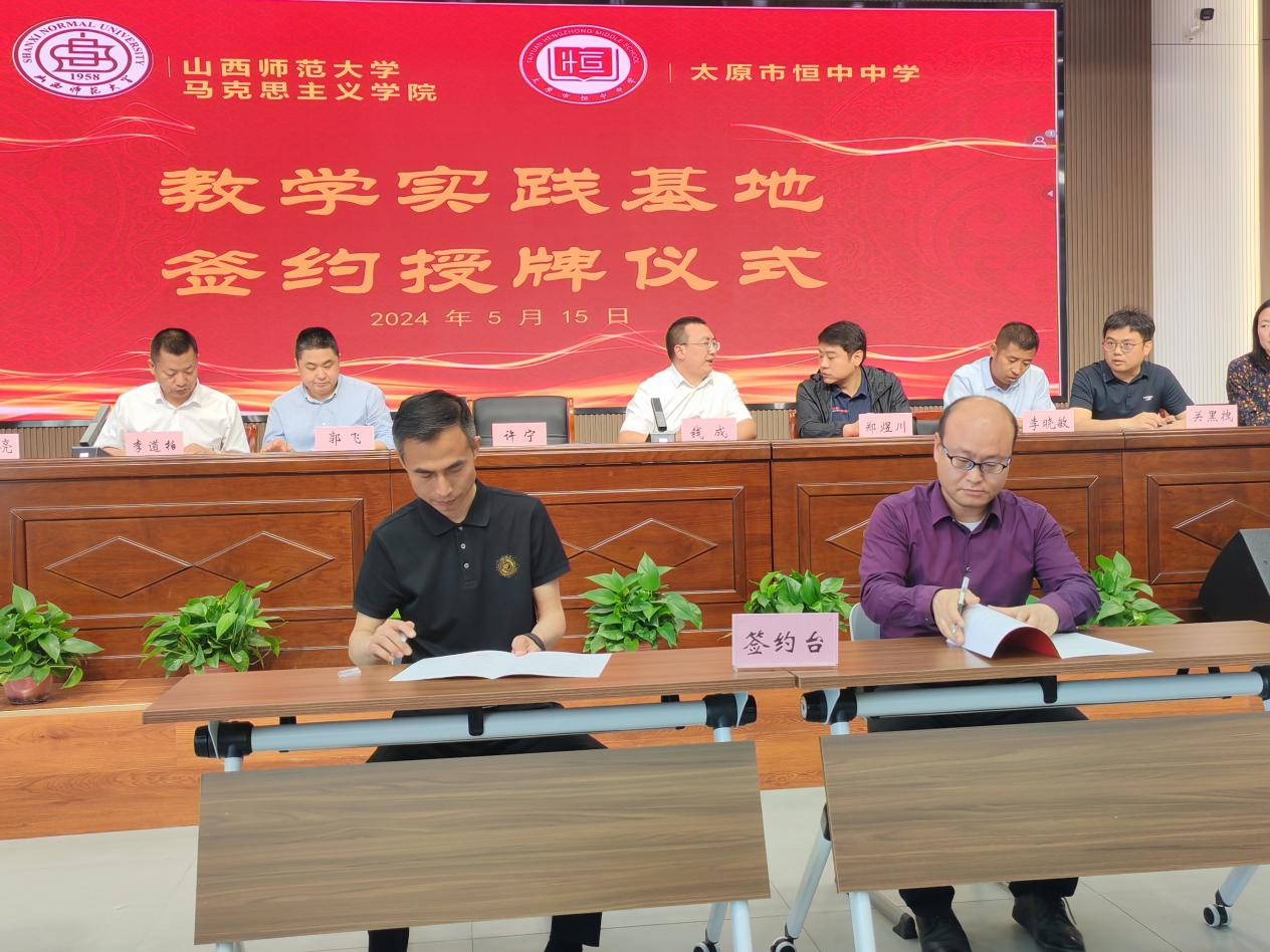 仪式上,太原市恒中中学校董事长许宁与副院长(挂职)杨海亮共同签署教学实践基地协议书,副院长(挂职)杨海亮为太原市恒中中学校授牌。此次活动对于扩大思想政治教育专业学生教学实践平台,增强赚钱软件 服务山西基础教育能力具有推动意义。