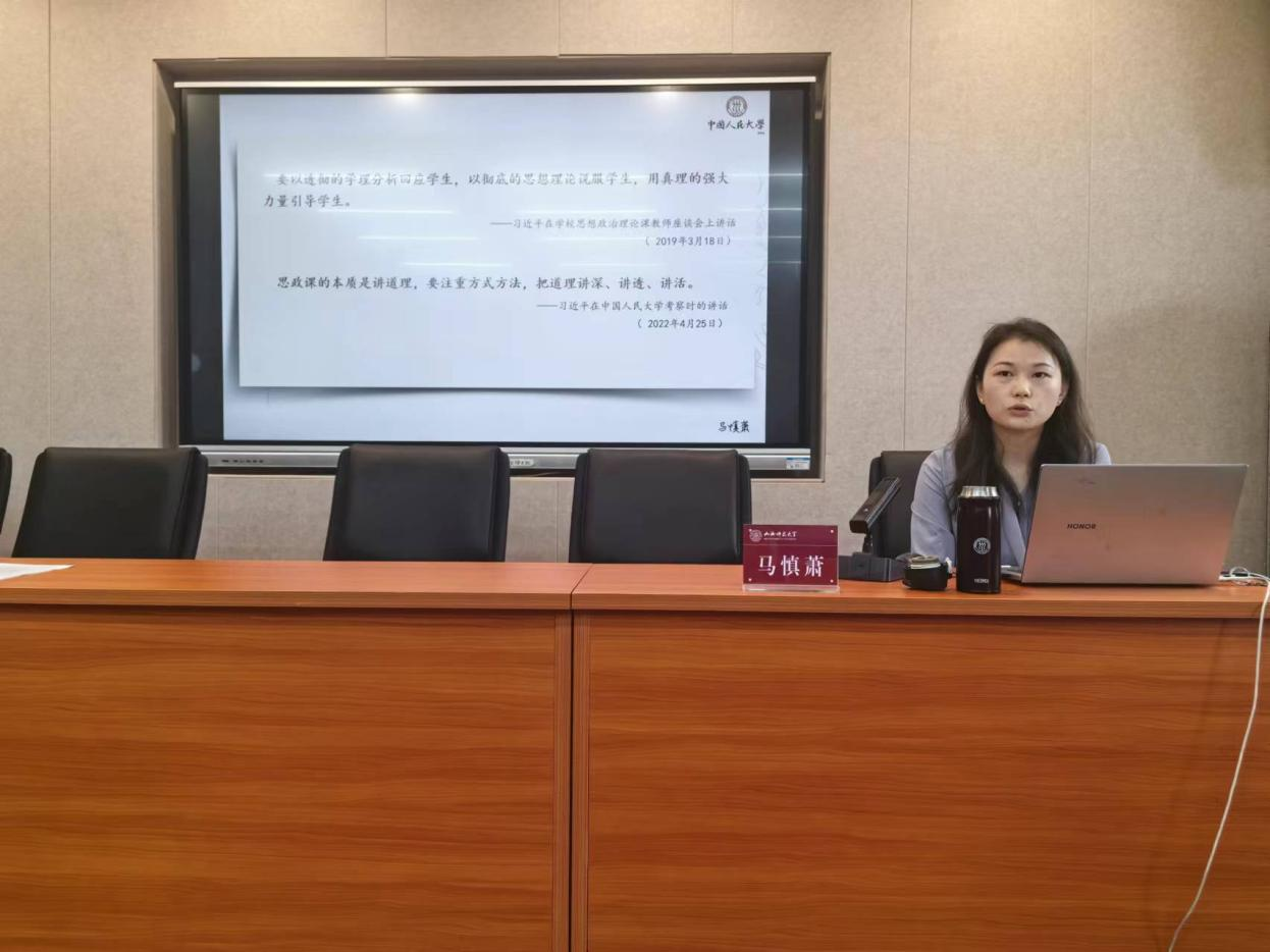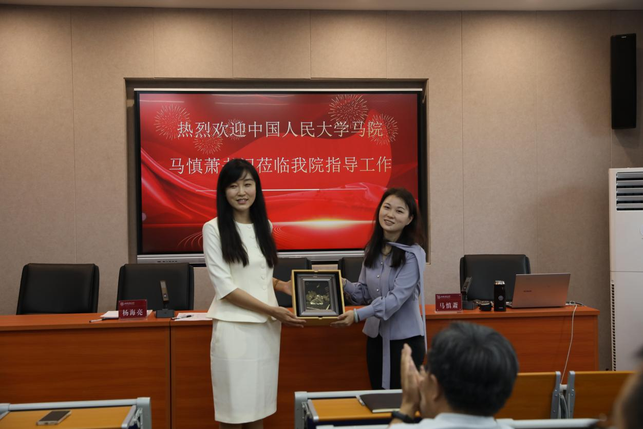 赠送精美纪念礼品。其次,马老师从学识积累、回应问题、教学设计等维度对思政课如何讲道理进行了系统阐释,结合原理课“资本主义经济金融化”“三问马克思主义”专题进行示范教学,分享了在教学备赛方面的经验心得。最后,与会教师围绕原理课教学研究热点焦点问题与马老师进行了热烈讨论。