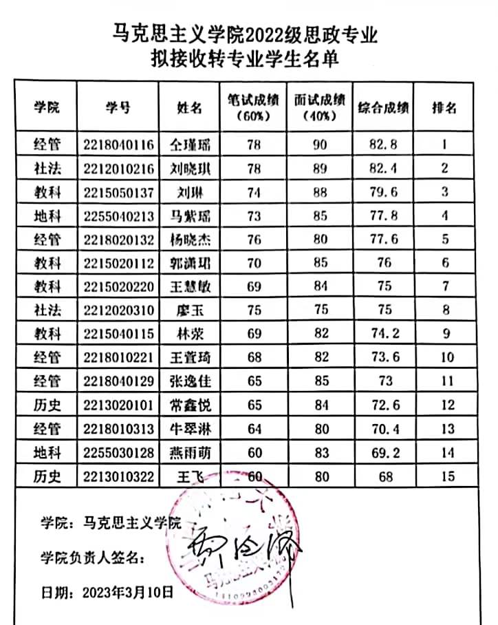 3月9日,赚钱软件 组织专家对所有申请转专业同学进行笔试和面试,经过基础测试,以下15位同学拟转入赚钱软件 思想政治教育专业学习(详见附件),现进行公示,如有异议,请联系2051508。