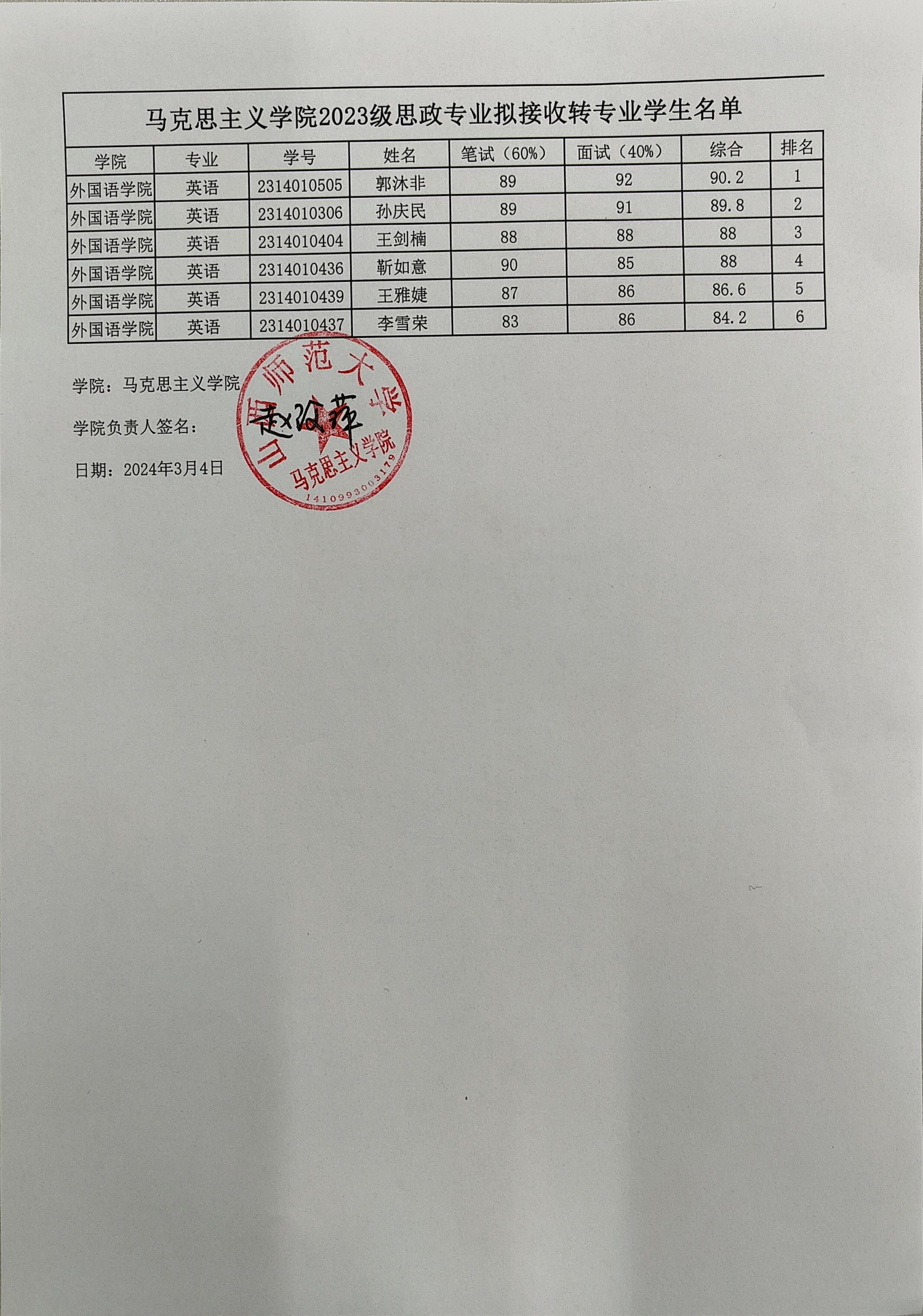 赚钱软件 2023级思政专业拟接收转专业学生名单