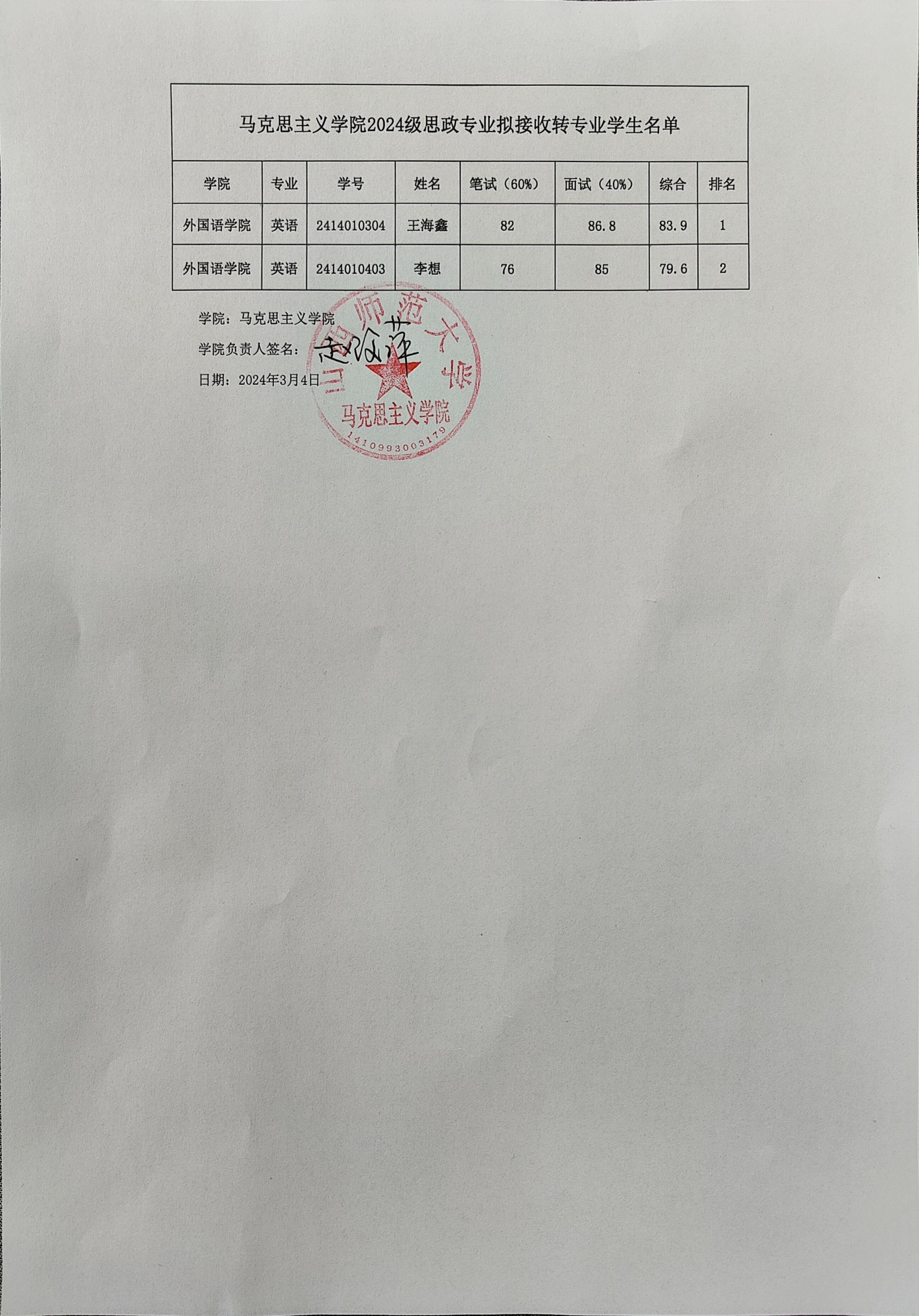 赚钱软件 2024级思政专业拟接收转专业学生名单