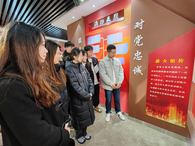 走进荣誉长廊,我们跟随刘指导员了解消防员战士的英雄事迹。在刘指导员的动情讲述下,我们为消防战士们向火光而行,逆人群而进的崇高精神而感到动容,他们身上强烈的责任感与使命感也激励着我们砥砺前行,不负人民。