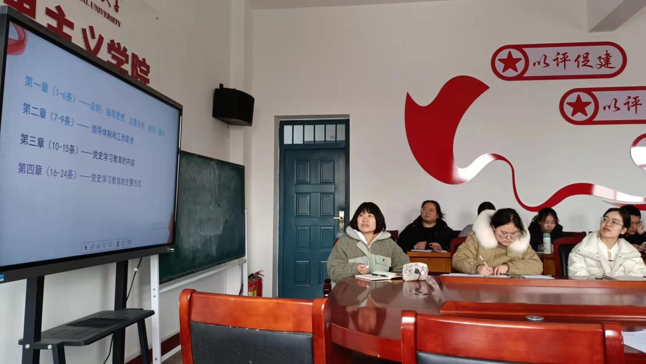 张玉婷书记带领大家学习了《党史学习教育工作条例》。开展党史学习教育,能够充分发挥党史以史鉴今、资政育人的作用。张玉婷书记提出,要树立正确的党史观,即坚持实事求是的思想路线,坚决反对和抵制历史虑无主义。要学习党的创新理论,将党史基本内容与伟大建党精神结合起来,与时俱进,为强国建设、民族复兴提供精神力量。最重要的是要将党史学习教育与中心工作结合起来,抓好经济建设这一中心工作,推动经济建设高质量发展,扎实推进中国式现代化。