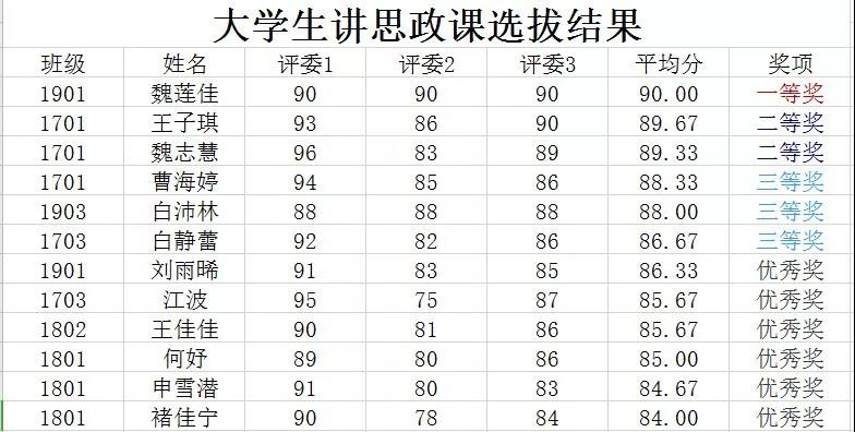 经过初赛的激烈角逐,共有12位选手进入本次决赛,并以三人为一组依次进行课堂展示,最后由评委点评打分。各位参赛选手以视频,板书,PPT等作为教学材料进行了十分钟精彩的思政课讲授。讲课主题包括哲学,党史,中国梦,中国近现代史,时代先锋模范等。参赛选手授课内容丰富、课程形式多样、语言生动活泼。在比赛最后,现场以评分制评选出一等奖1名,二等奖2名,三等奖3名。