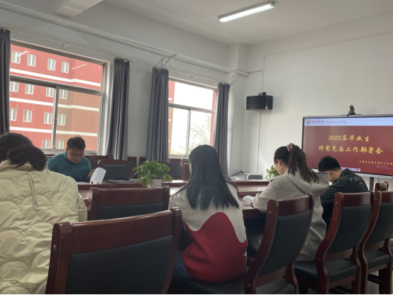 在1号教学楼506会议室召开2023届毕业生供需见面工作部署会。会议由院党委副书记、学工组长杜辉主持,团委副书记张瑞琴、本科教学秘书李丽丽、研究生教学秘书葛秀琴、专职辅导员张瑞和毕业班辅导员参会。