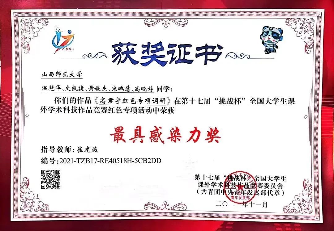 宋鹏慧与团队四位成员申报的作品《高君宇红色专项调研》成功入围,荣获全国三等奖、省级一等奖以及“最具感染力奖”。