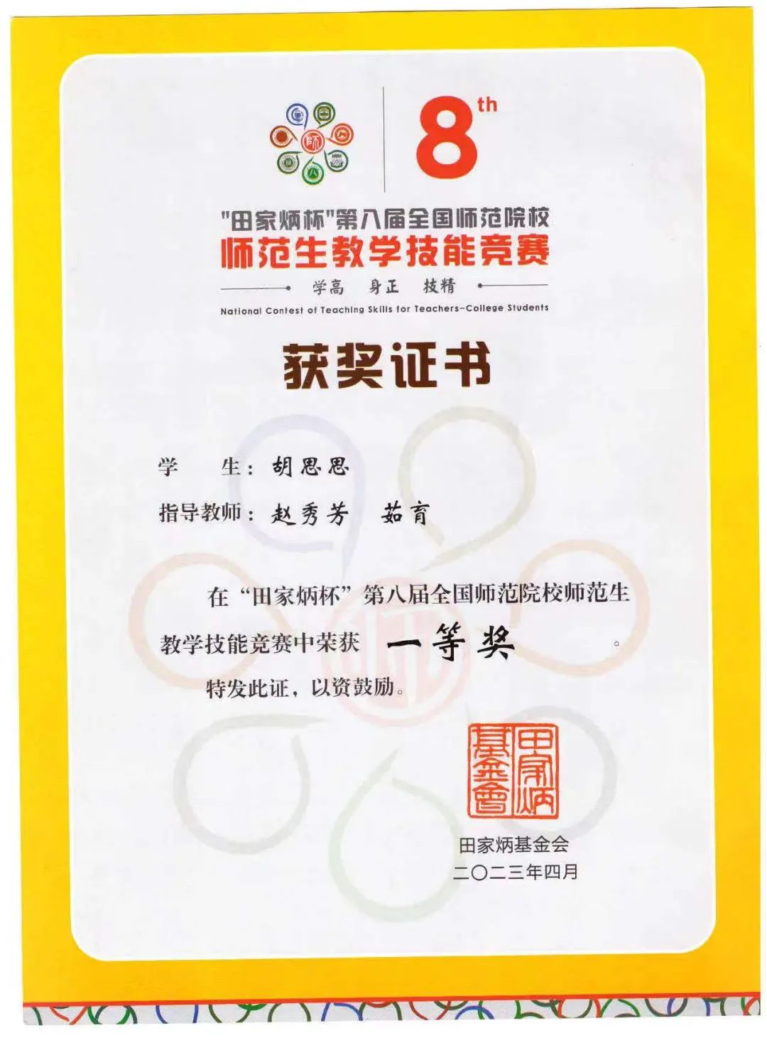 参赛选手胡思思的师范技能获得全面提升,入围决赛并在紧张激烈的决赛中表现优异,获得一等奖的佳绩。
